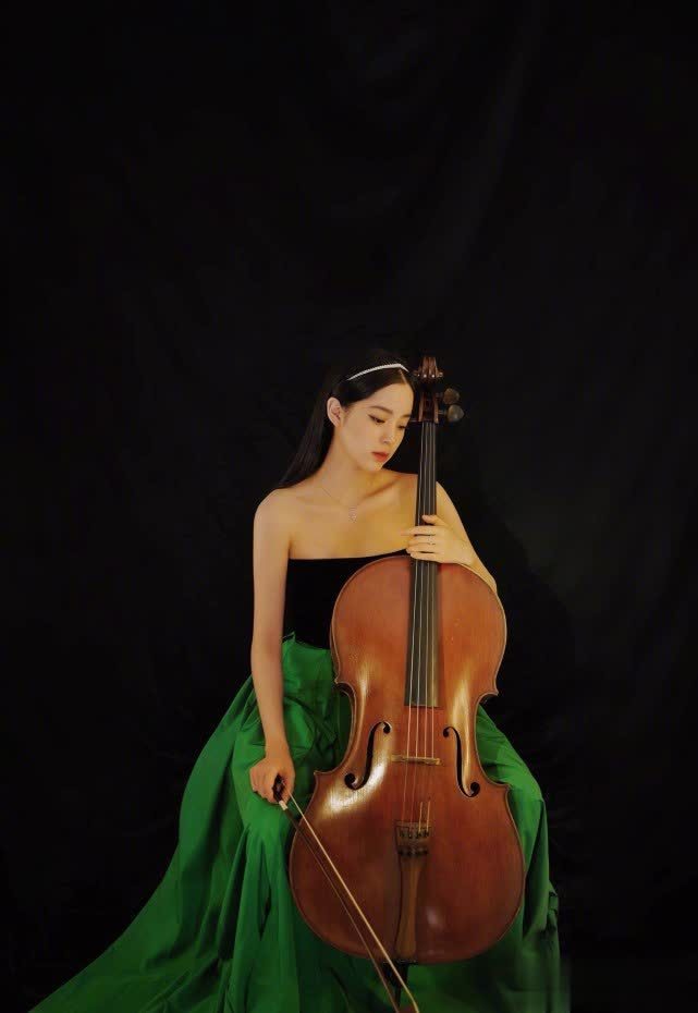 欧阳娜娜却勇敢挑战深绿色长裙,看上去高贵优雅,搭配大提琴,名媛范儿十足。